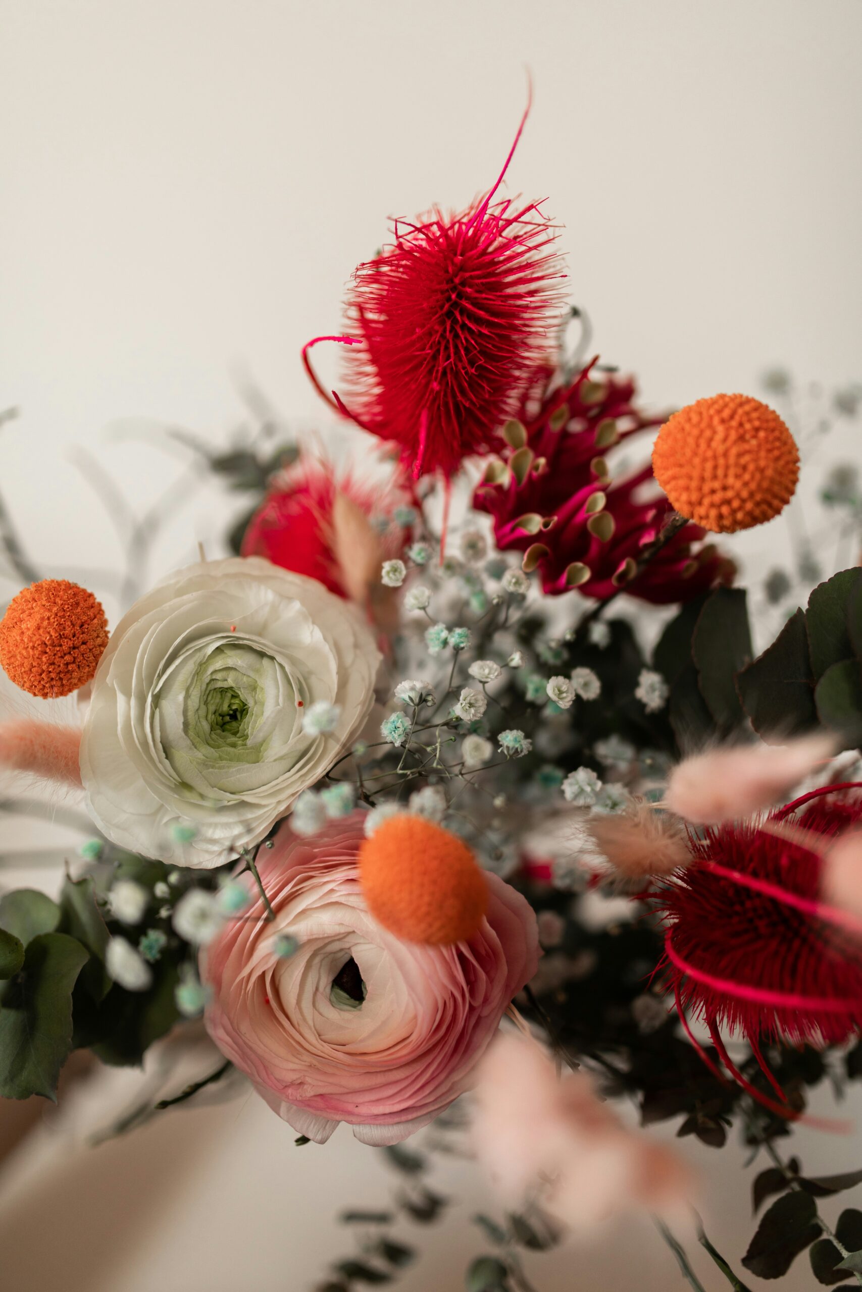 - Play with scale: Mix large blooms like hydrangeas or amaryllis with smaller filler flowers and foliage to create layered, dimensional displays.