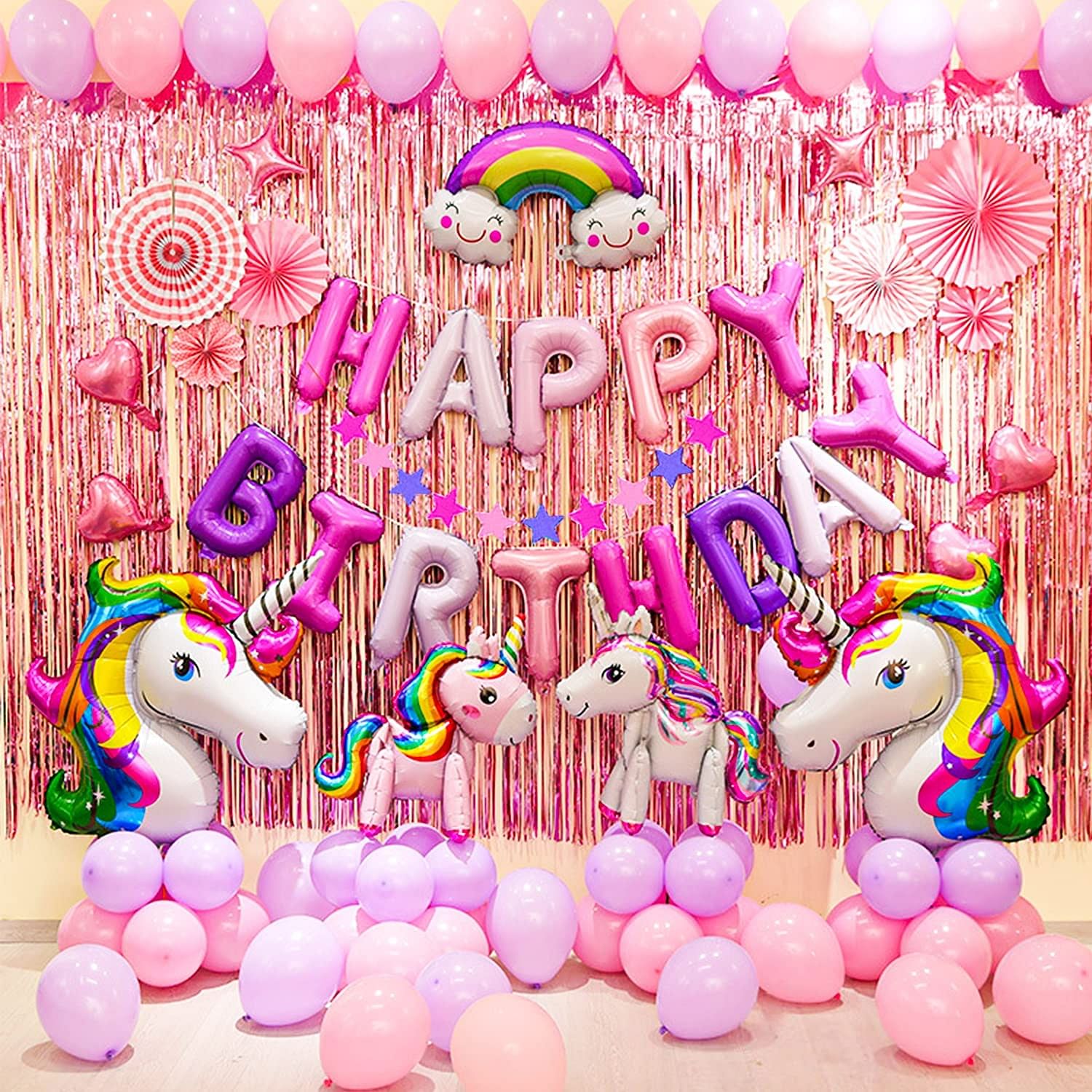 - Unicorn Balloons: Fill the party space with unicorn balloons in pastel colors. You can also add a large unicorn balloon as a centerpiece to the party table.