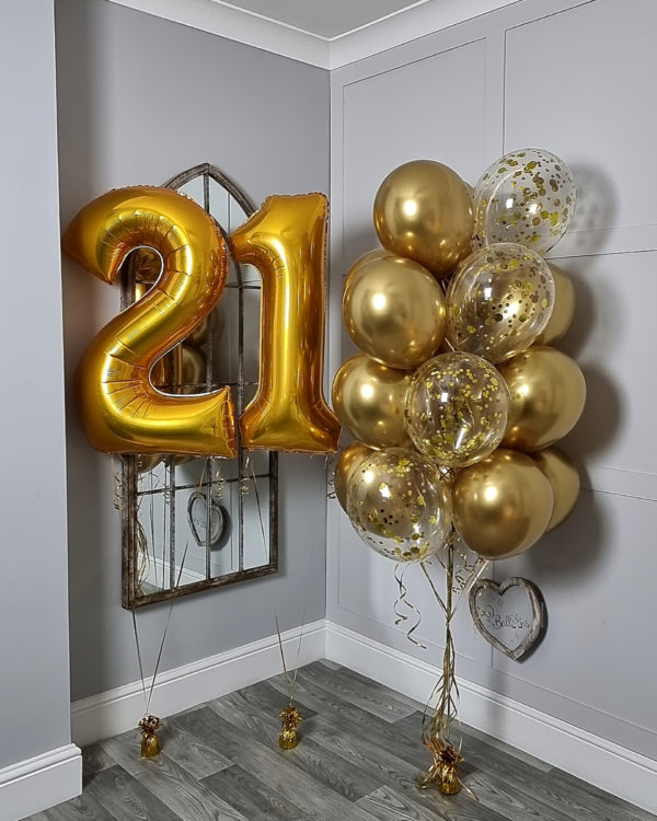 - Large gold number “21” balloons