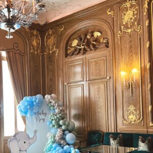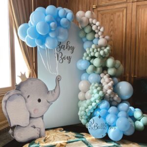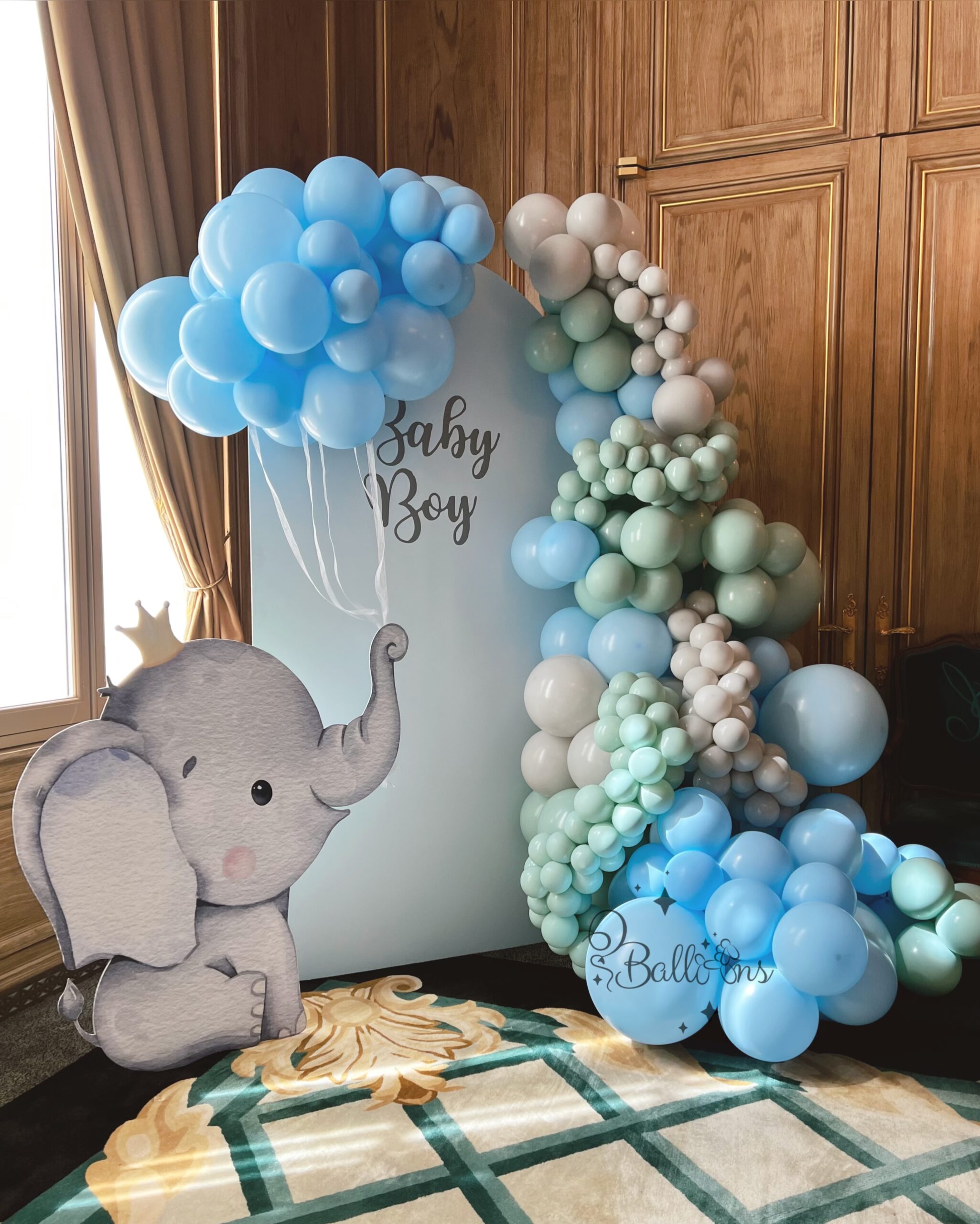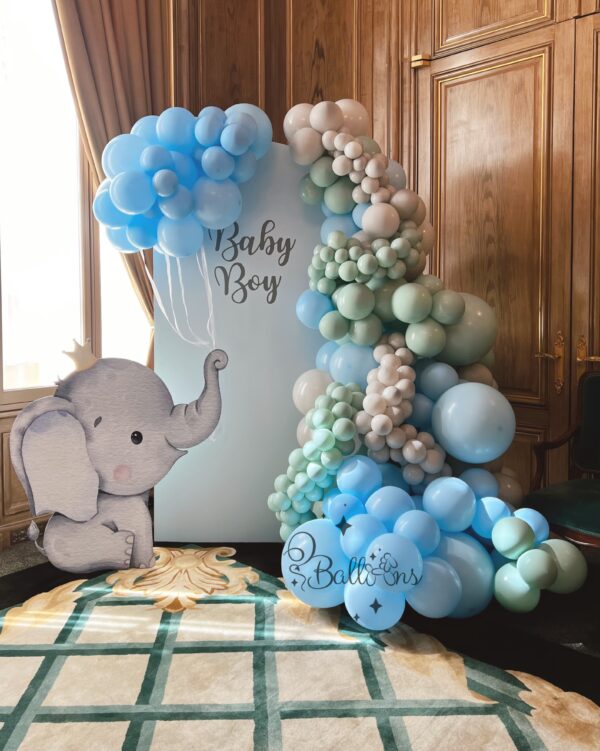 Welcome your little prince in style with our Baby Boy Celebration Balloon Display, featuring a delightful mix of pastel blues, greens, and creams to create an enchanting and memorable scene. This set includes a beautifully crafted balloon garland cascading elegantly across a personalized backdrop that reads “Baby Boy.” Adding a touch of whimsy is an adorable 3D elephant cutout, making it a perfect centerpiece for baby showers, birthdays, or welcome-home celebrations.