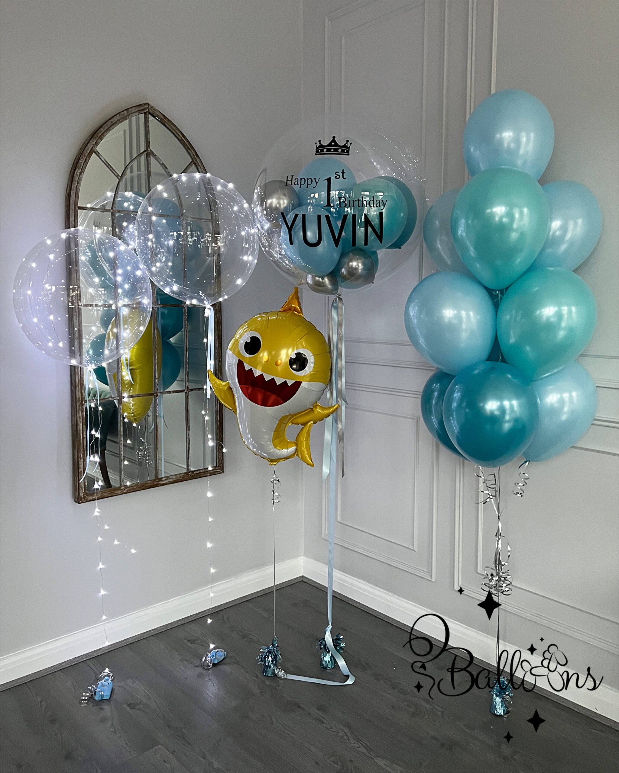 One 10 Balloons Bouquet, Large Personalised Balloon, Yellow Baby Shark, Two LED balloons