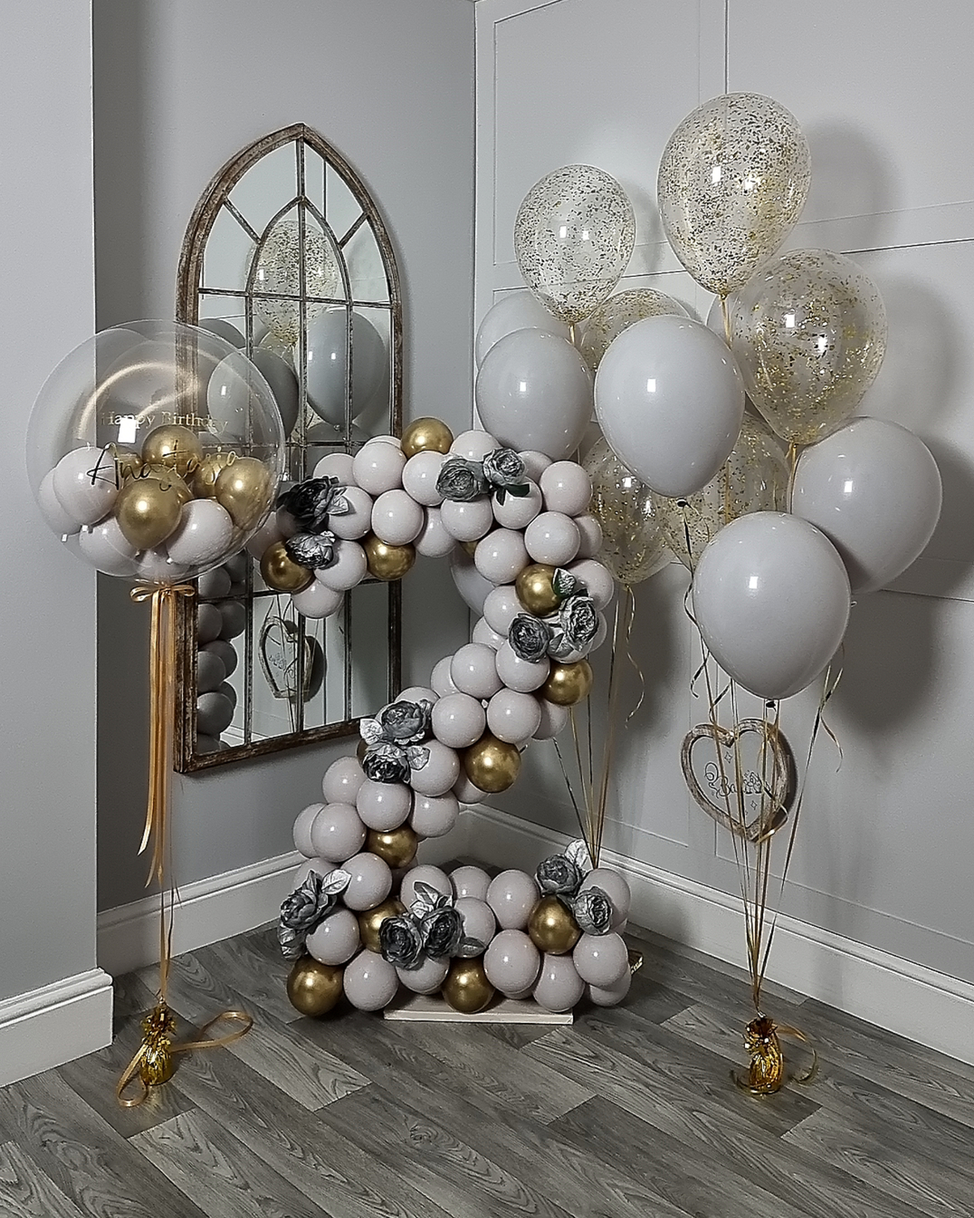 - Large number “2” balloon sculpture decorated with marble and gold balloons
