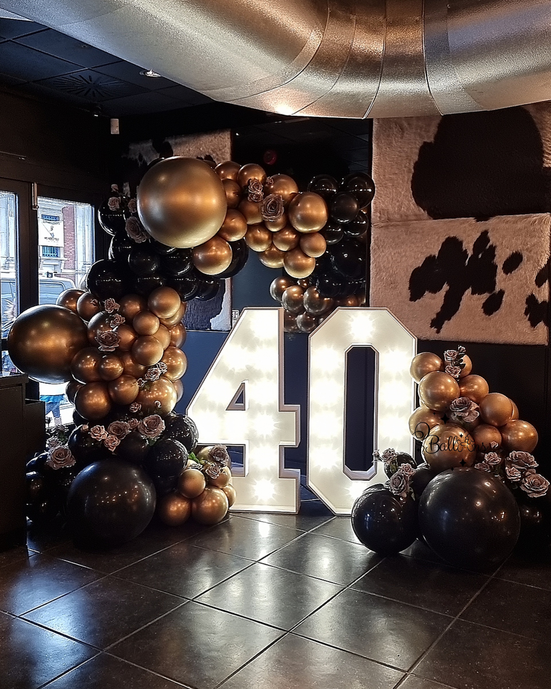Celebrate a milestone birthday in style with our Elegant Black and Gold 40th Birthday Balloon Display. This stunning setup features a sophisticated arrangement of black and gold balloons, complemented by light-up numbers “40” to make the occasion truly memorable. Accented with metallic roses and large orb balloons, this display brings a touch of elegance and glamour, perfect for milestone birthdays or upscale celebrations. Delivered fully inflated and professionally arranged, it’s designed to impress and create a striking backdrop for photos and memories.