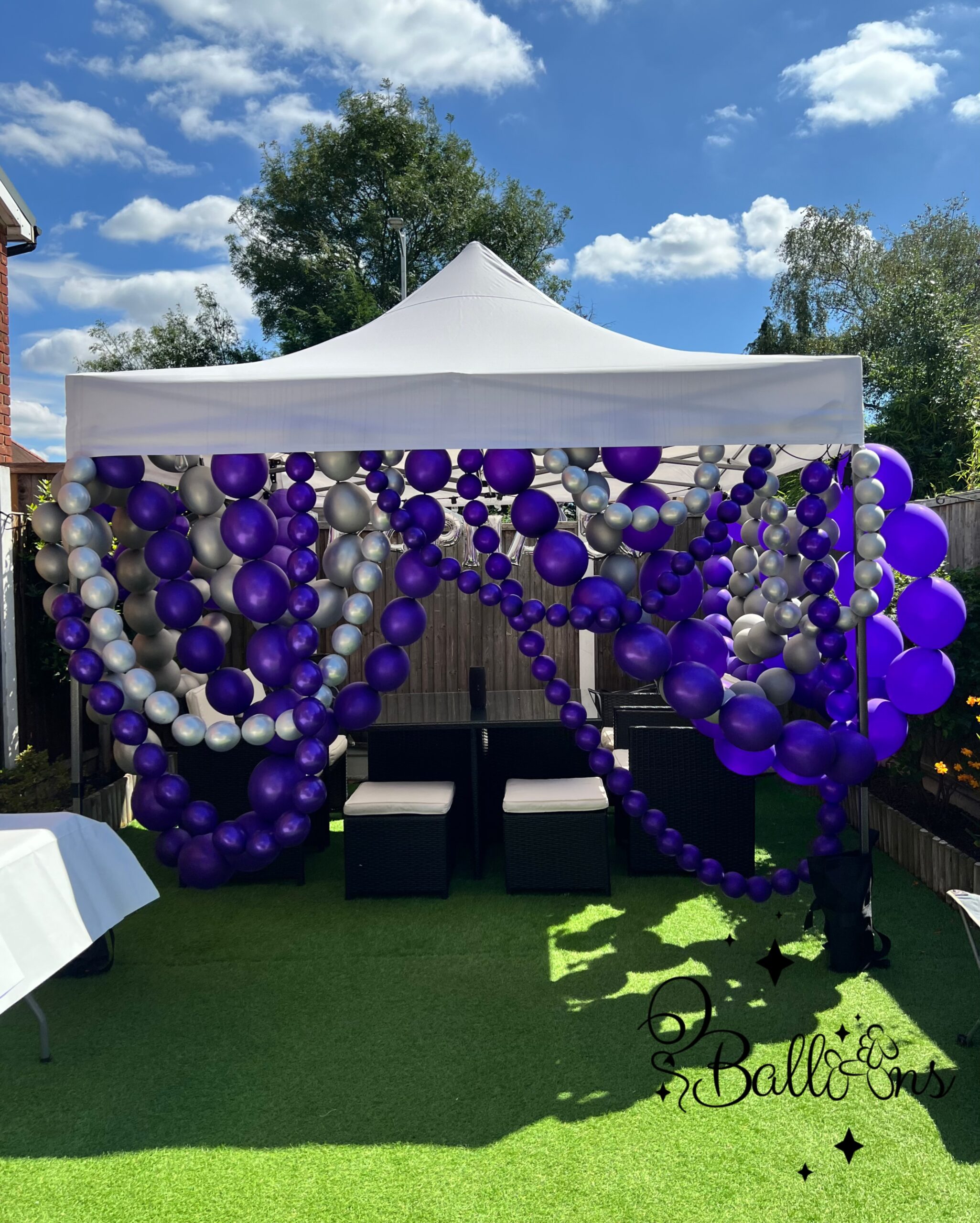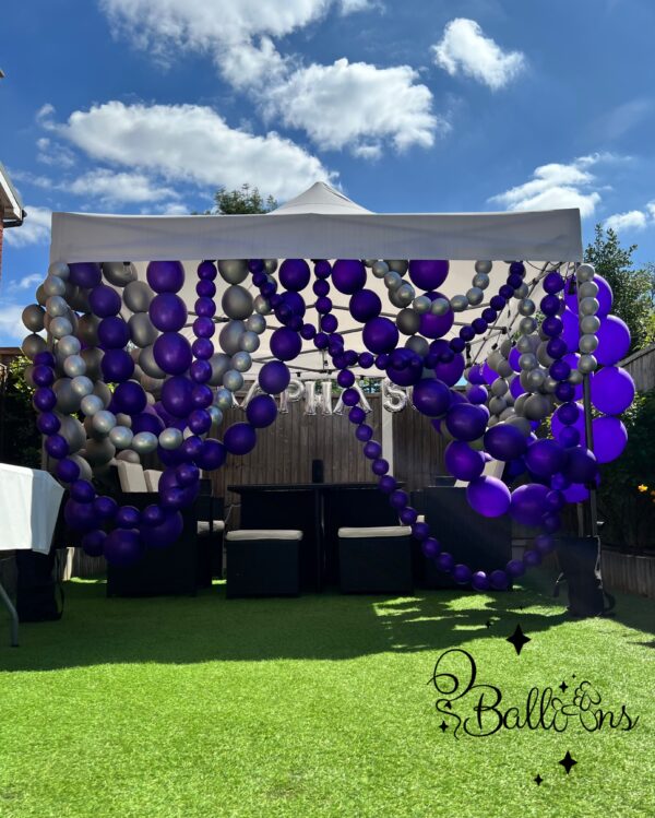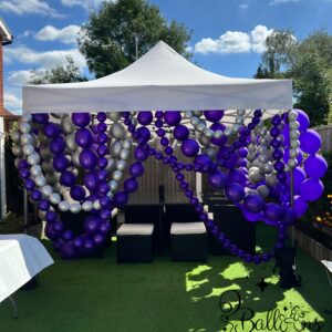 Elevate your outdoor event with our stunning balloon drape decoration, perfect for tents, gazebos, or any open-air setup. This beautiful arrangement, showcased in elegant purple and silver, can be customized to match your event’s color scheme. Ideal for weddings, birthdays, and garden parties, this decoration adds a touch of sophistication and charm to your celebration. Our professional team will handle the setup, ensuring everything is perfectly arranged.