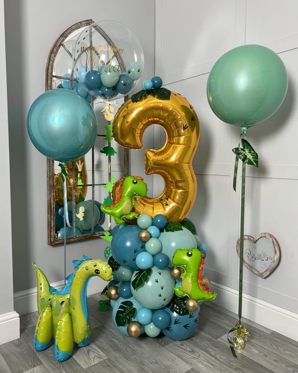 Make your little one’s birthday a roaring success with our Dinosaur Adventure Birthday Balloon Display! This playful setup features a large gold number balloon surrounded by a cluster of vibrant green, teal, and blue balloons, along with adorable dinosaur balloons for a fun prehistoric theme. A personalized clear bubble balloon adds a custom touch, making it the perfect decoration for any dinosaur lover’s celebration. Delivered fully inflated, this display is ready to bring smiles and excitement to your child’s special day!