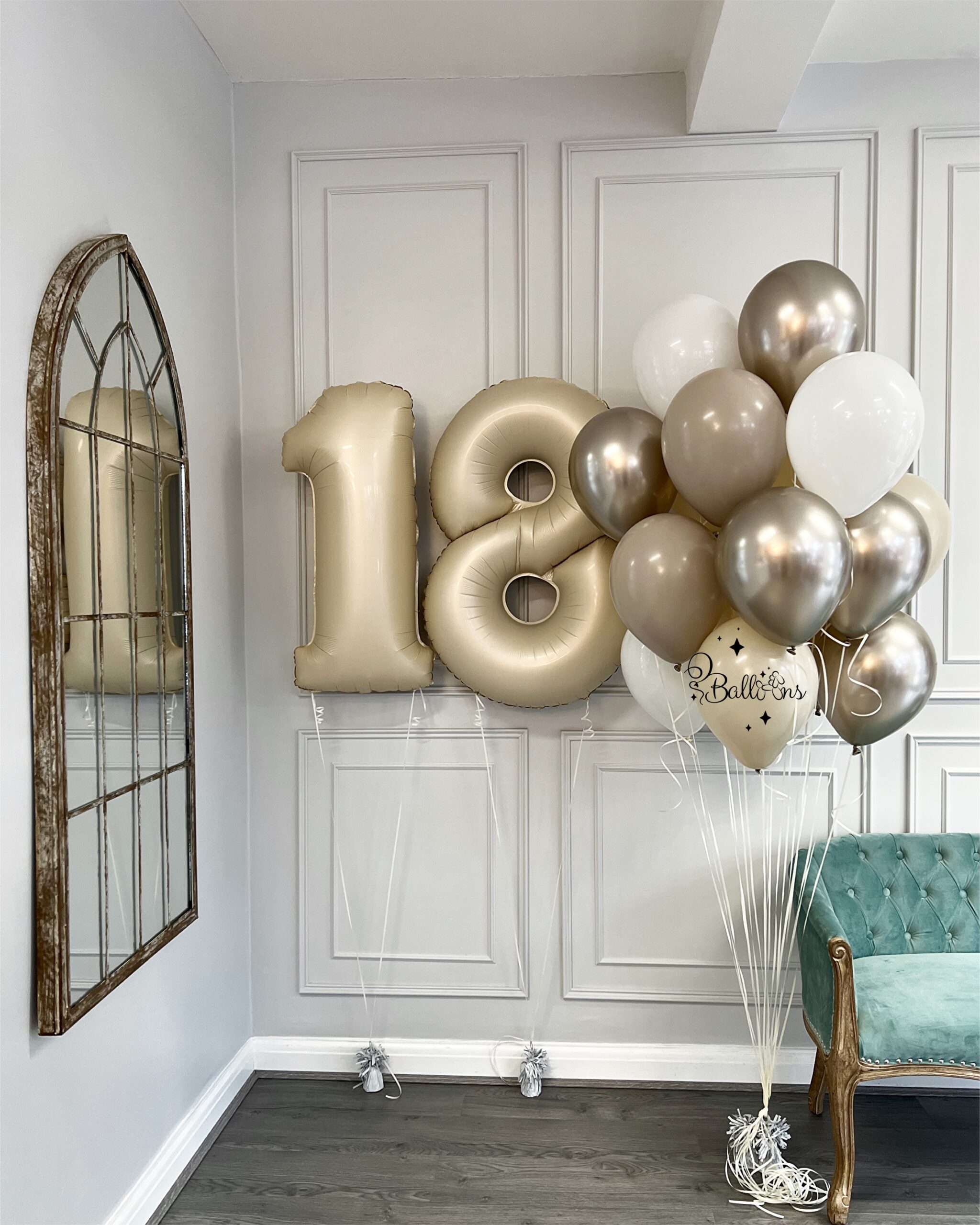 20 helium inflated 11 inch balloons. 2 digit number foil balloon.