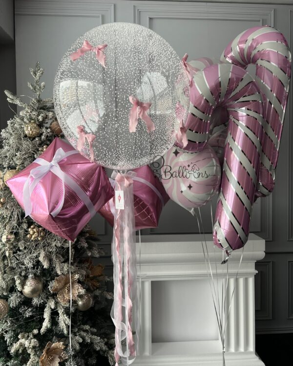 Celebrate the festive season with this elegant and playful Candy Pink Christmas Balloon Bundle! Featuring a mix of candy cane balloons, ribboned pink present balloons, and a snow-filled clear balloon with delicate pink bows, this arrangement is perfect for adding a touch of whimsy and luxury to your holiday décor or event. Ideal for Christmas parties, holiday photoshoots, or as a unique seasonal gift.