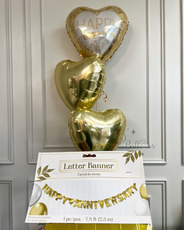 - 1 Gold Heart Foil Balloon with “Happy Anniversary” Text