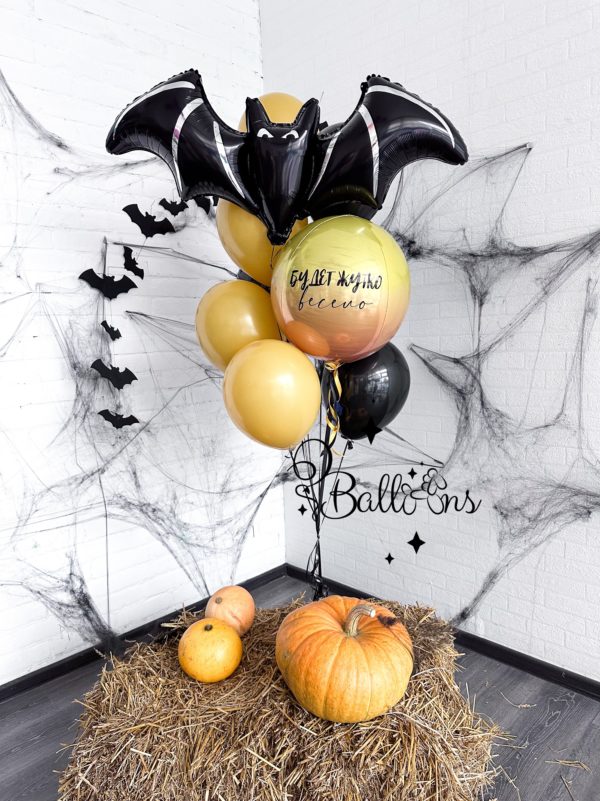 Large balloon bouquet with personalised balloon and cute bat.