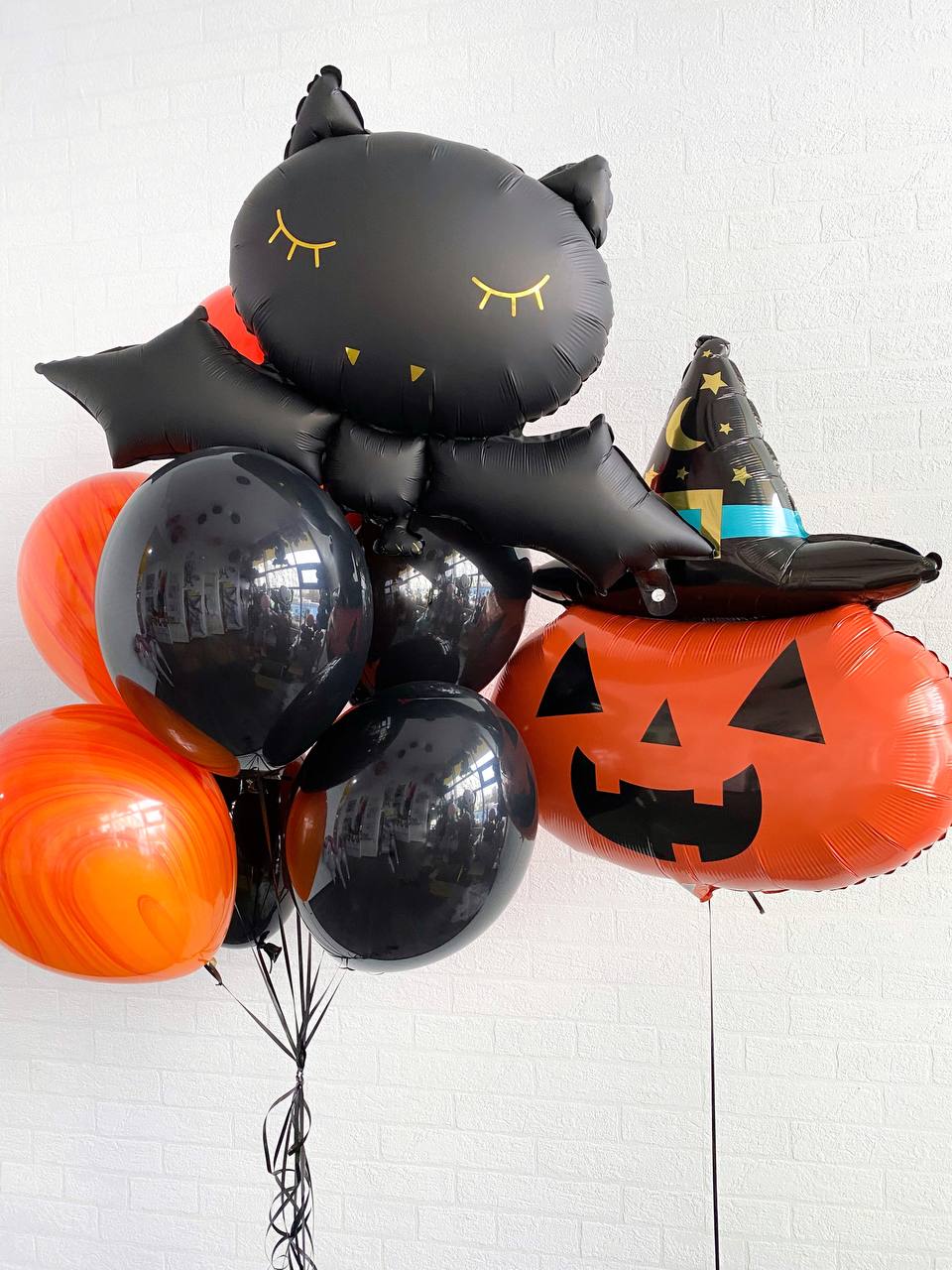 Large balloon bouquet of 8 latex balloons, 1 Pumpkin, 1 Bat.