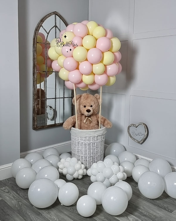 Bring a touch of whimsy and charm to any celebration with our adorable Hot Air Balloon Teddy Basket Display. Featuring a plush teddy nestled in a white wicker basket and topped with a stunning balloon arrangement in soft pastel shades, this display is perfect for birthdays, baby showers, and gender reveals. The gentle pink and yellow balloon cluster adds a playful touch, making it a delightful centerpiece or photo backdrop for your event. Delivered fully inflated, it’s ready to add joy and charm to your special occasion!