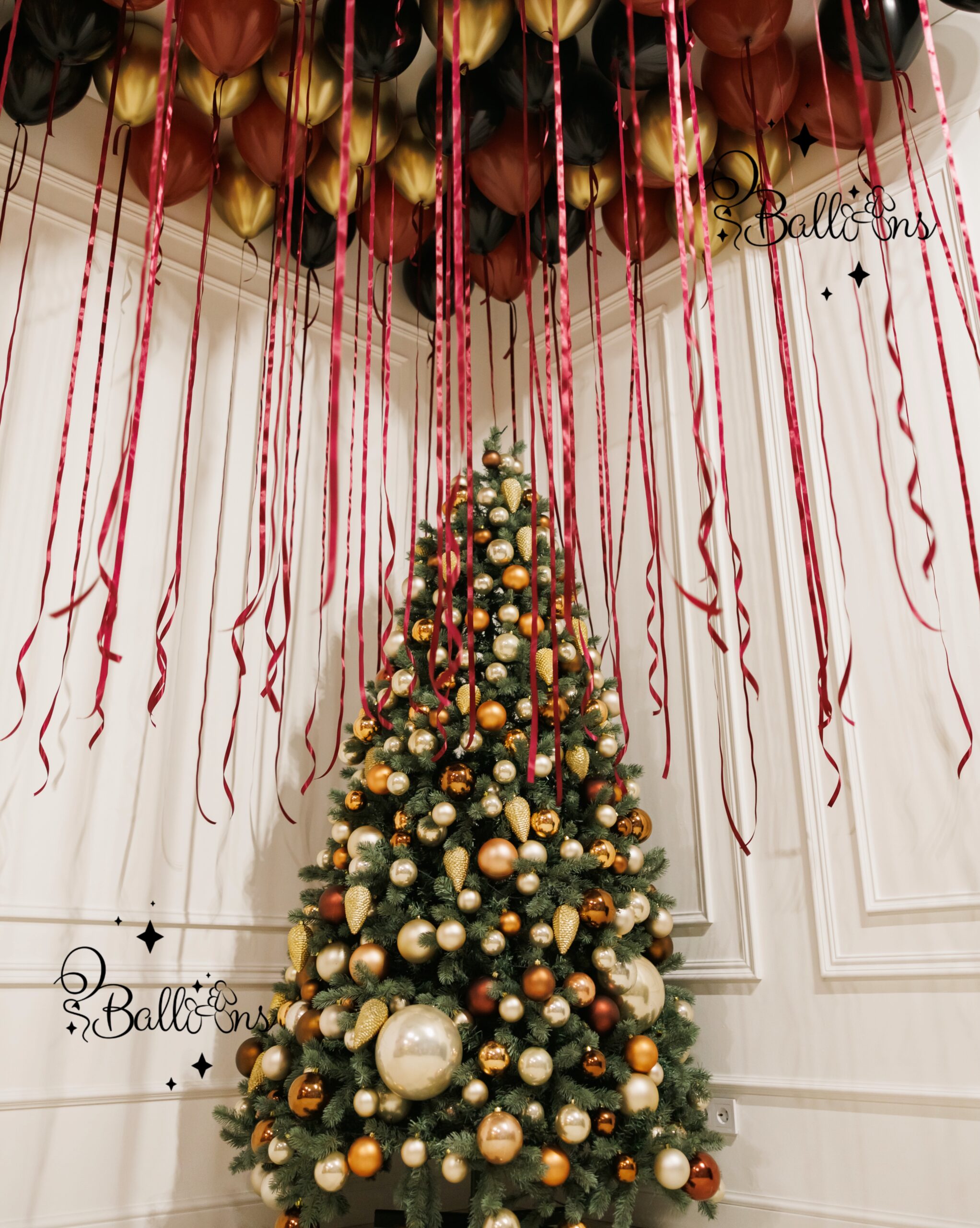 Create breathtaking, cinematic impact with our Luxury Ceiling Balloon Drop, designed in rich burgundy, gold, and black tones for a dramatic, high-end look. This premium installation fills your ceiling with elegant floating balloons and long satin ribbons that cascade beautifully, transforming any room into a magical festive space.