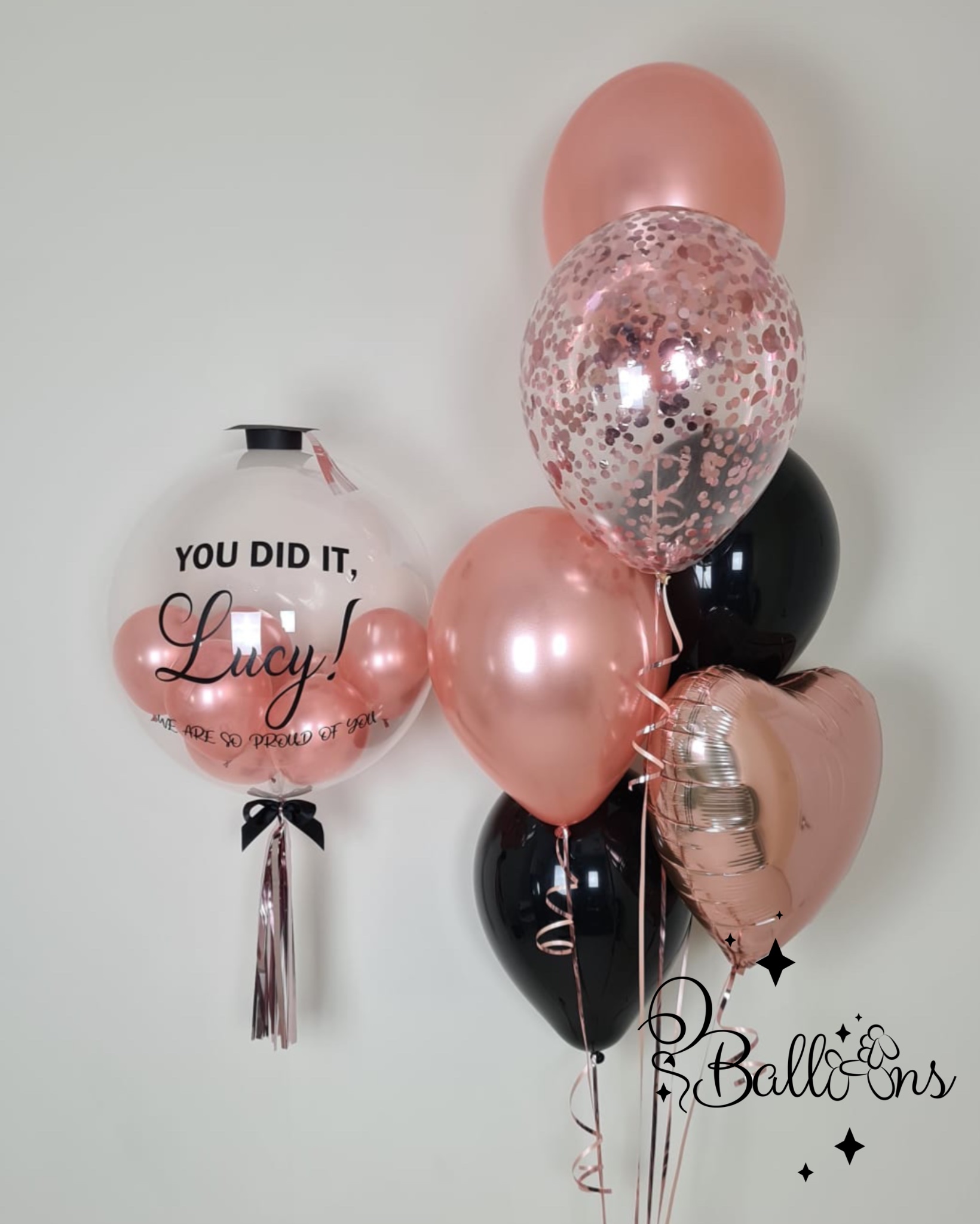 1 bubble balloon with little balloons inside, graduation hat on the balloon, tassel and bow