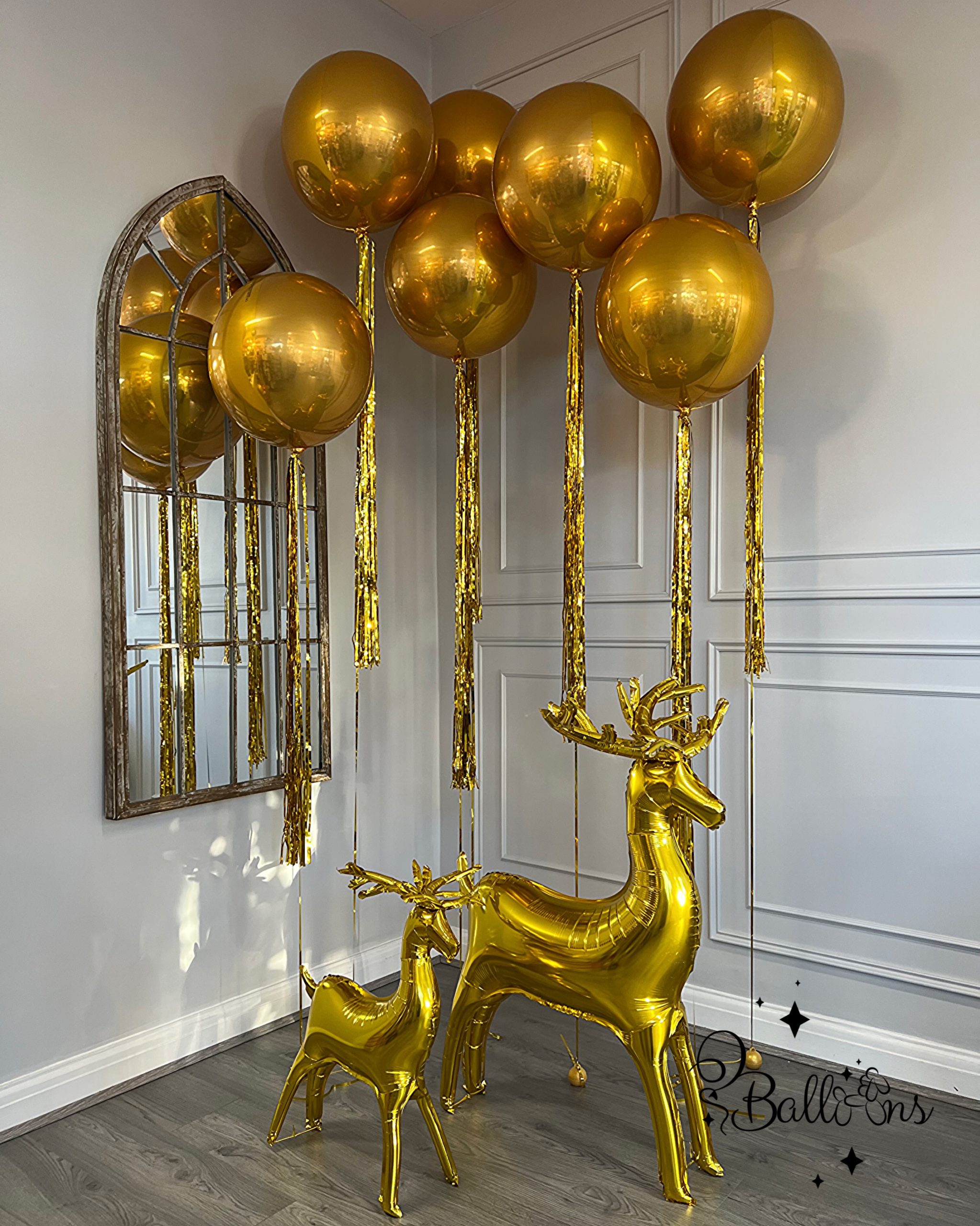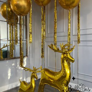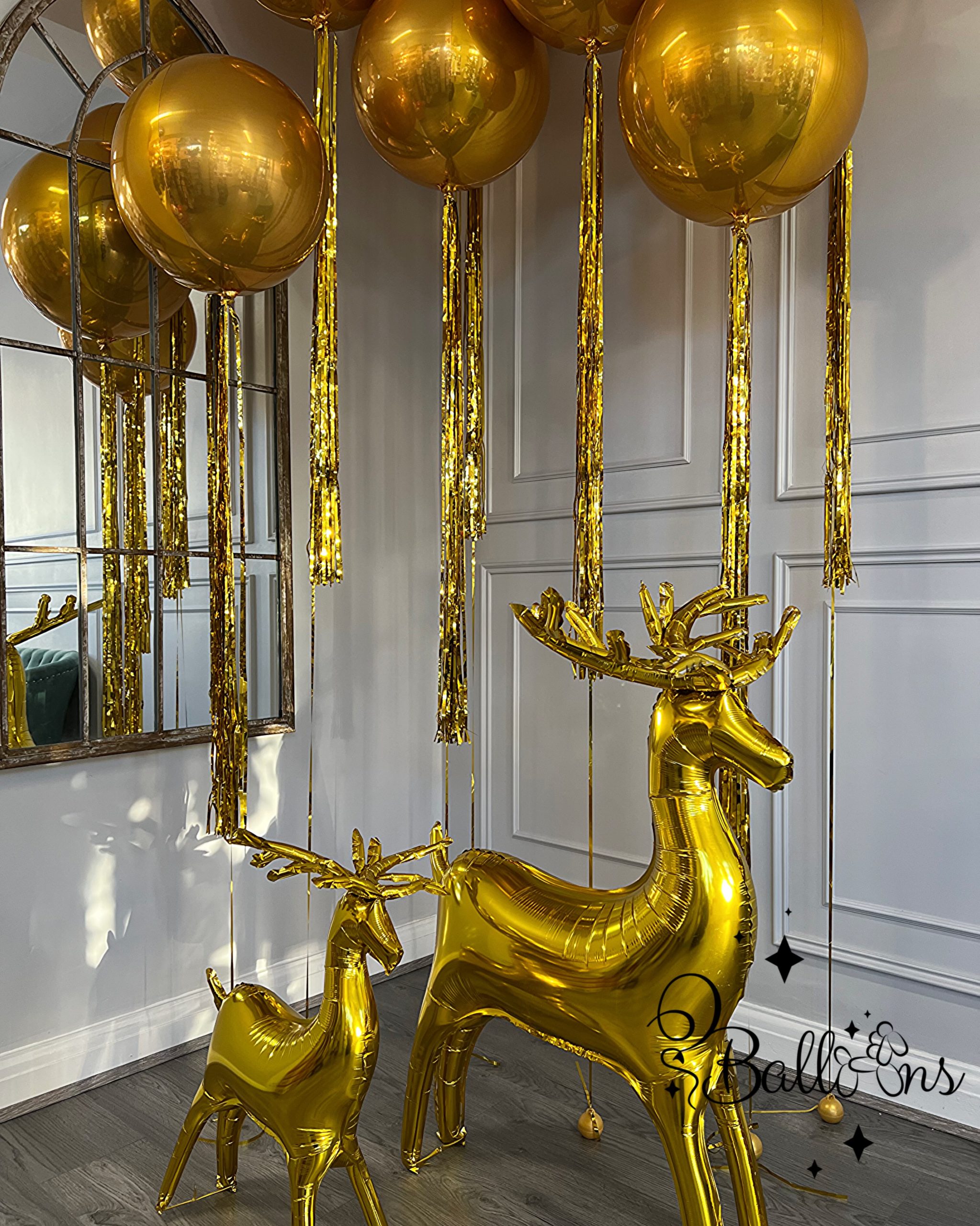 Create a luxurious festive atmosphere with our Golden Reindeer Balloon Set, designed to elevate any Christmas celebration with elegance and shine. This stunning arrangement includes a pair of gold foil reindeer and a cluster of oversized gold balloons with shimmering tassels, making it ideal for events, photoshoots, home decor, or corporate displays.