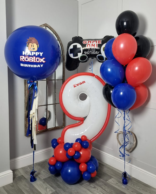 Bring the excitement of gaming to your child’s birthday with our vibrant Roblox-themed balloon set! This eye-catching arrangement features a large personalized number “9” balloon, a “Happy Roblox Birthday” balloon, and a “Game On” controller balloon, complemented by a bouquet of red, blue, and black helium balloons. Perfect for a Roblox enthusiast, this set creates a fun and dynamic atmosphere for their special day.