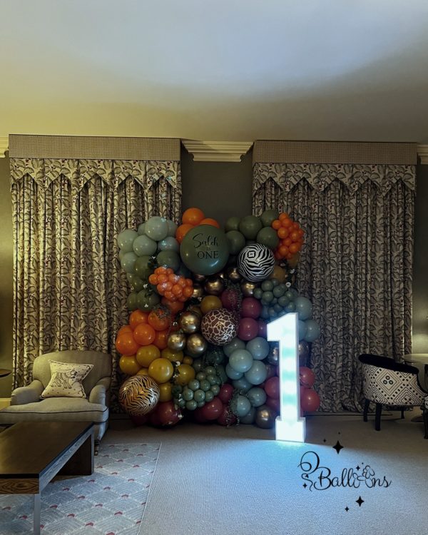 This lovely safari-themed photo area is for little Saleh who turned 1 and his family and friends! A gorgeous mix of colours and balloon sizes, this decor is just a right size for a home birthday party! Animal print patterns make it really cute and cheerful, while a neon number shape completes the look!