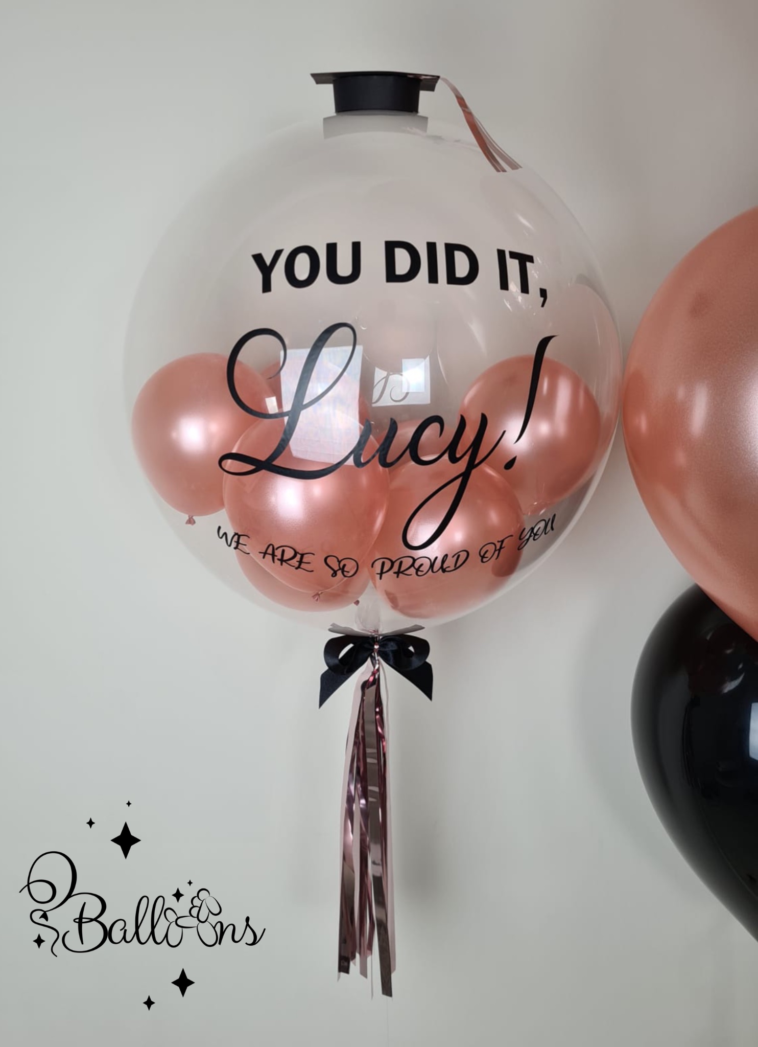 1 bubble balloon with little balloons inside, graduation hat on the balloon, tassel and bow.