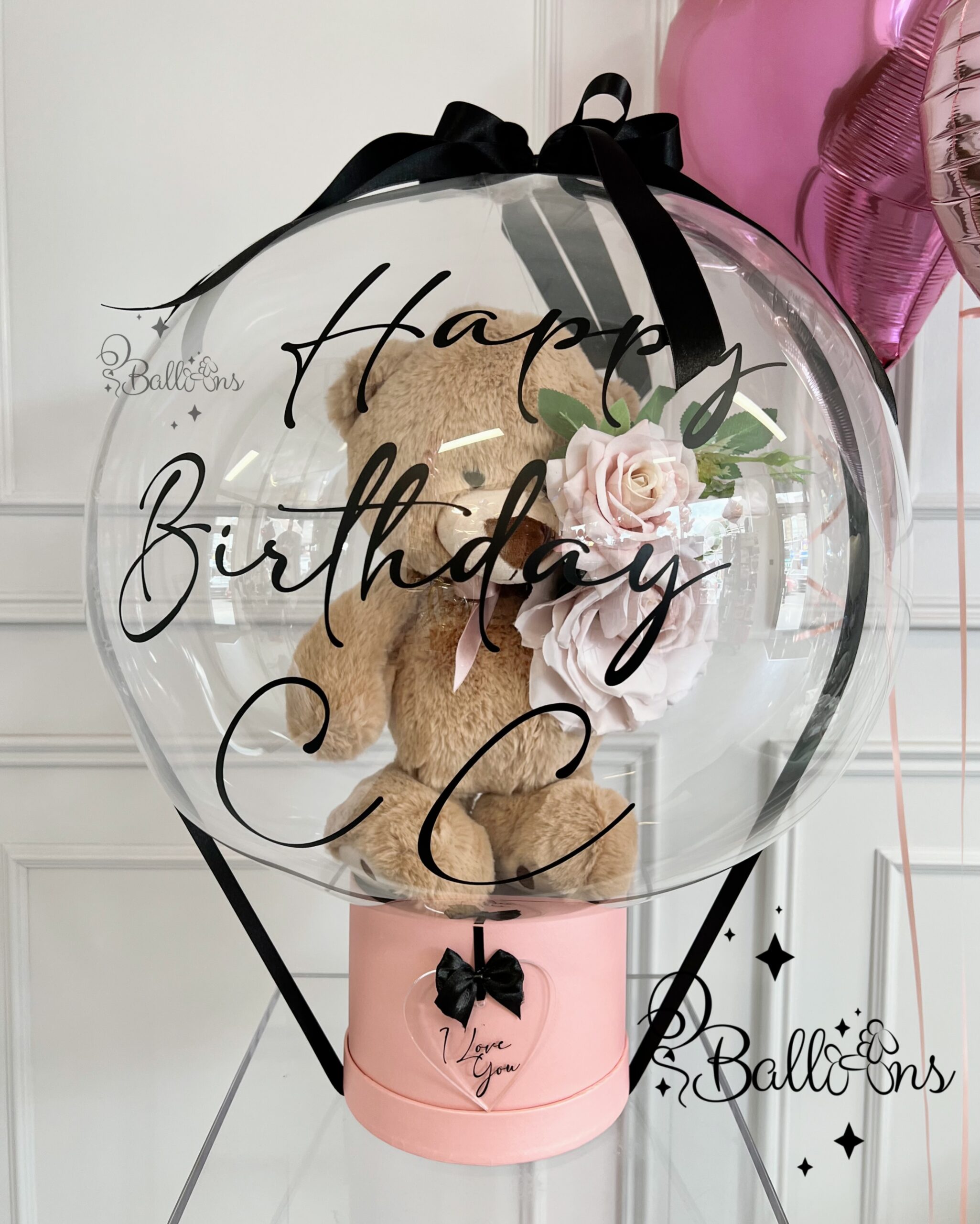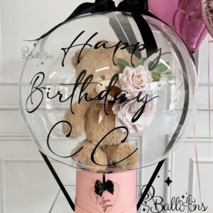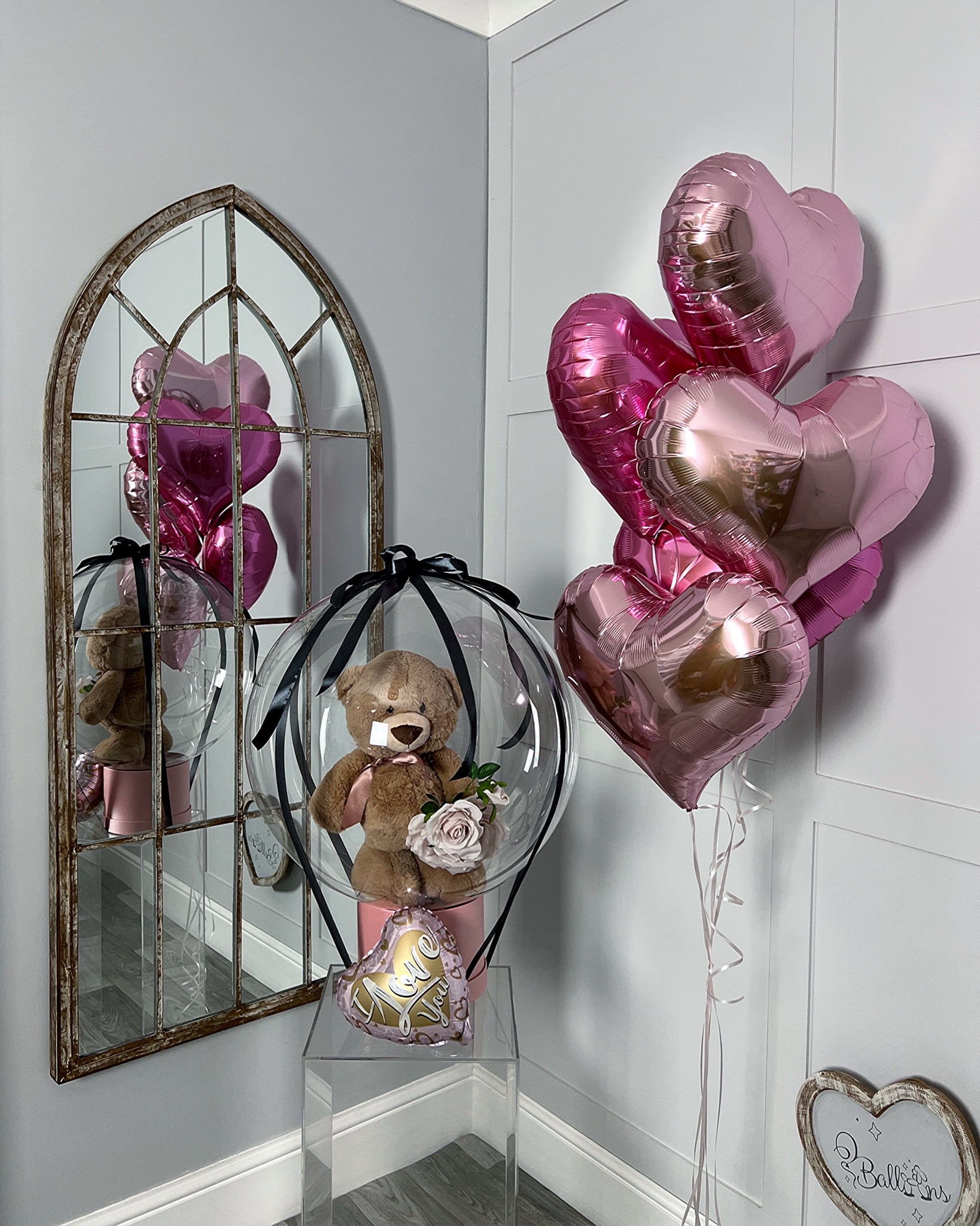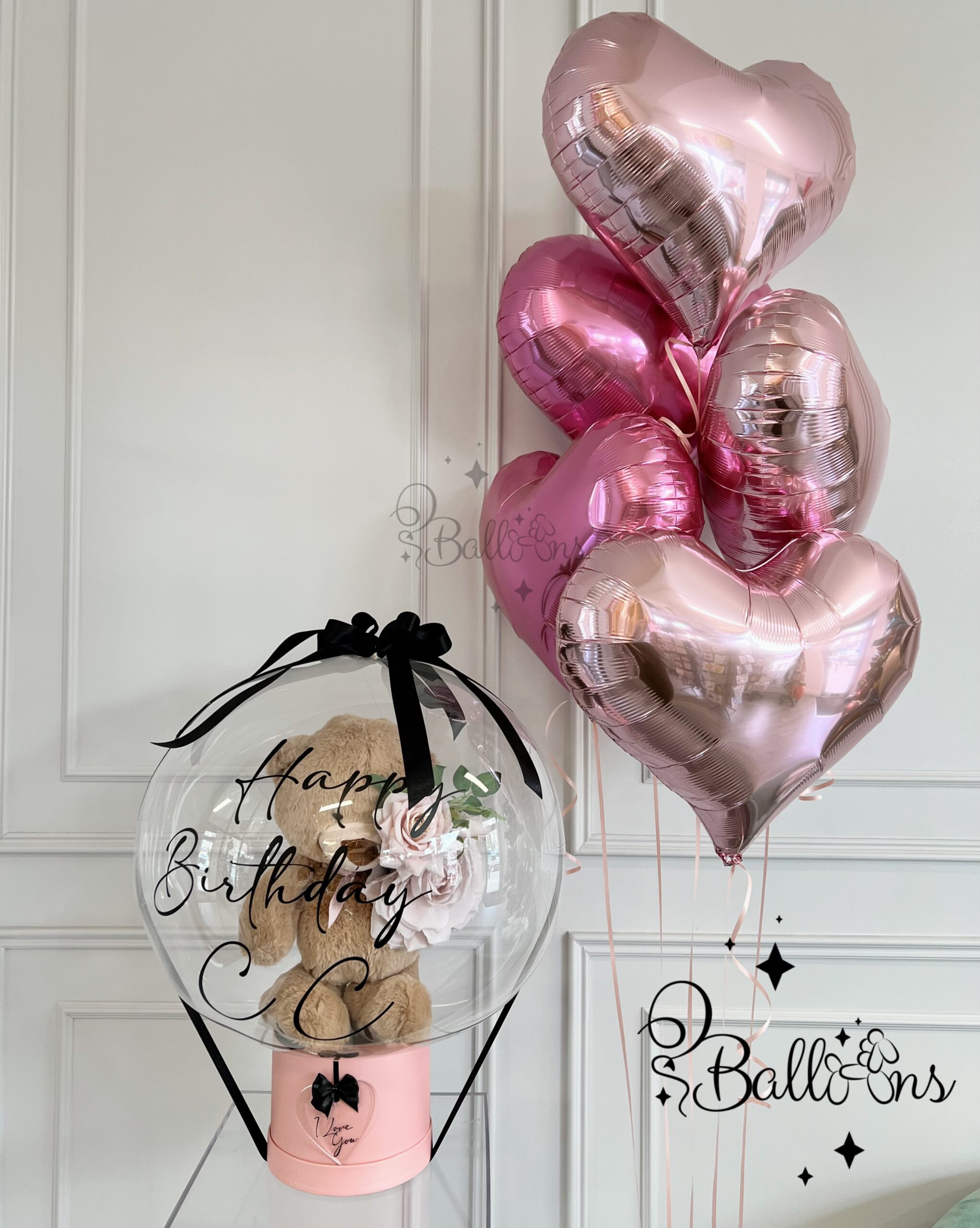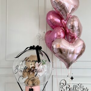 Surprise your loved one with this adorable and elegant Romantic Teddy in Balloon arrangement! Featuring a plush teddy bear nestled inside a large clear balloon, adorned with a ribbon and accompanied by a bouquet of pink heart-shaped balloons, this display is perfect for birthdays, anniversaries, Valentine’s Day, or just to show someone you care. The combination of soft pink and gold tones adds a touch of romance and charm. Delivered fully inflated, this setup is ready to bring smiles and warmth to any occasion!