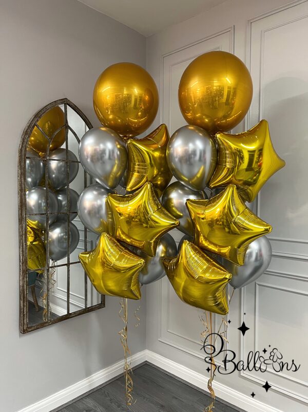 Each Balloon Bouquet made with: One Orbz, 3 Star Foil Balloons and 6 Silver 11 inch Latex Balloons. But you can choose any other colour.