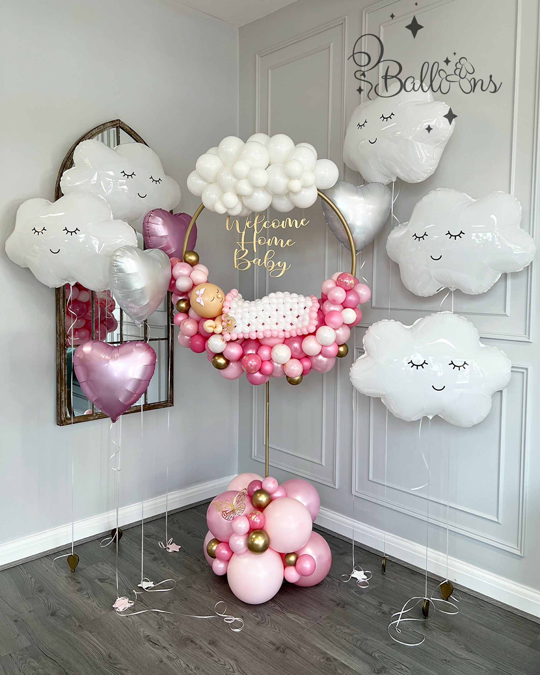 Celebrate the arrival of your little one with our enchanting Welcome Home Baby Cloud Balloon Display. This dreamy setup features a soft pink and white color scheme, complete with cloud-shaped balloons and a whimsical balloon cradle. Adorned with a “Welcome Home Baby” sign and heart-shaped accents, this arrangement is perfect for baby showers, welcome home celebrations, and newborn photo sessions. Designed to create a serene, magical atmosphere, this display is delivered fully inflated and ready to bring joy and warmth to your special day.